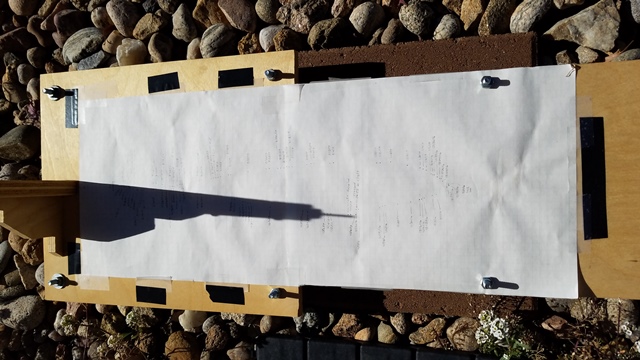 A close up view of the last reading on November 12, 2017. The Analemma was supposed to be contineous, lining up, but a bit behind (a leap year effect) the dot placed there on November 12, 2016. What I suspected happened was the fact that I releveled my viewer about every 2 months. This showed that the dirt under my concrete pavers moved a bit. What I didn't do is to check the celestial North alignment about August 2017. This is when I believe (and can be seen in the plots of Activity #4) that the ground may have twisted the convrete pavers, and hence my Viewer, in addition to the rise and fall of the dirt under the pavers. That would account for the final reading being off as it is.