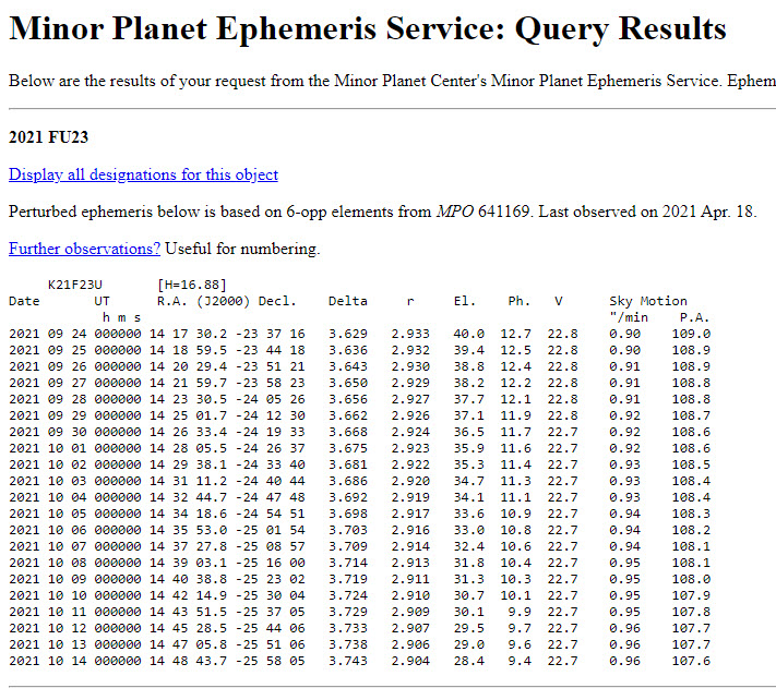 Ephmeris from Minor Planet Center