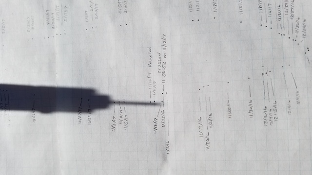 A close up view of the last reading on November 12, 2017. The Analemma was supposed to be contineous, lining up, but a bit behind (a leap year effect) the dot placed there on November 12, 2016. What I suspected happened was the fact that I releveled my viewer about every 2 months. This showed that the dirt under my concrete pavers moved a bit. What I didn't do is to check the celestial North alignment about August 2017. This is when I believe (and can be seen in the plots of Activity #4) that the ground may have twisted the convrete pavers, and hence my Viewer, in addition to the rise and fall of the dirt under the pavers. That would account for the final reading being off as it is.