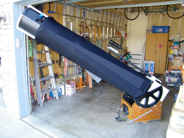 This is a picture of my finished scope, on the afternoon of April 15, 2011. I have it poking out the garage door, for I wanted to use it this night to view, but the sky was threatening to be totally overcast. From this picture, my 12.5 inch, f/8 telescope looks very long as compared to other shorter focal length dobsonian telescopes.